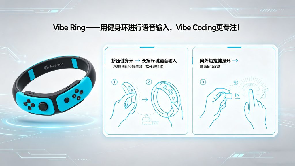 分享一个超级有趣又实用的开源项目——Vibe Ring,来自开发者 wong2(https://github.com/wong2/vibe-ring)。如果你经常用Mac进行语音输入(比如配合闪电说等AI语音工具)写代码、写文档,却讨厌一直按住Fn键唤醒,或者想边锻炼边Coding,那这个工具简直是为你量身定制的!它把落灰的Nintendo Switch健身环(Ring-Con)变成智能输入设备:挤压健身环 = 长按Fn键(触发语音输入),向外短拉 = 敲击Enter键(发送/确认),让“Vibe Coding”变得又酷又健康!